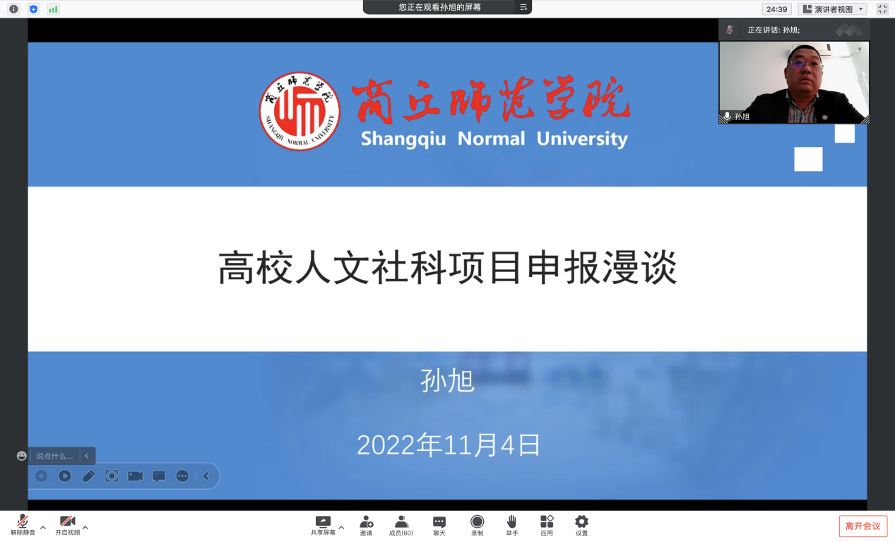 为加强学院科研实力,有效提升学院教师在项目申报、前期论证、项目实施等方面的能力。11月5日下午,WilliamHill威廉希尔通过腾讯会议的方式在线举办了科研项目申报动员暨培训活动,WilliamHill威廉希尔院长孙旭进行了《高校人文社科项目申报漫谈》专题讲座,就项目申报的相关问题进行了细致讲解,并就2023年的科研项目申报进行了动员部署。