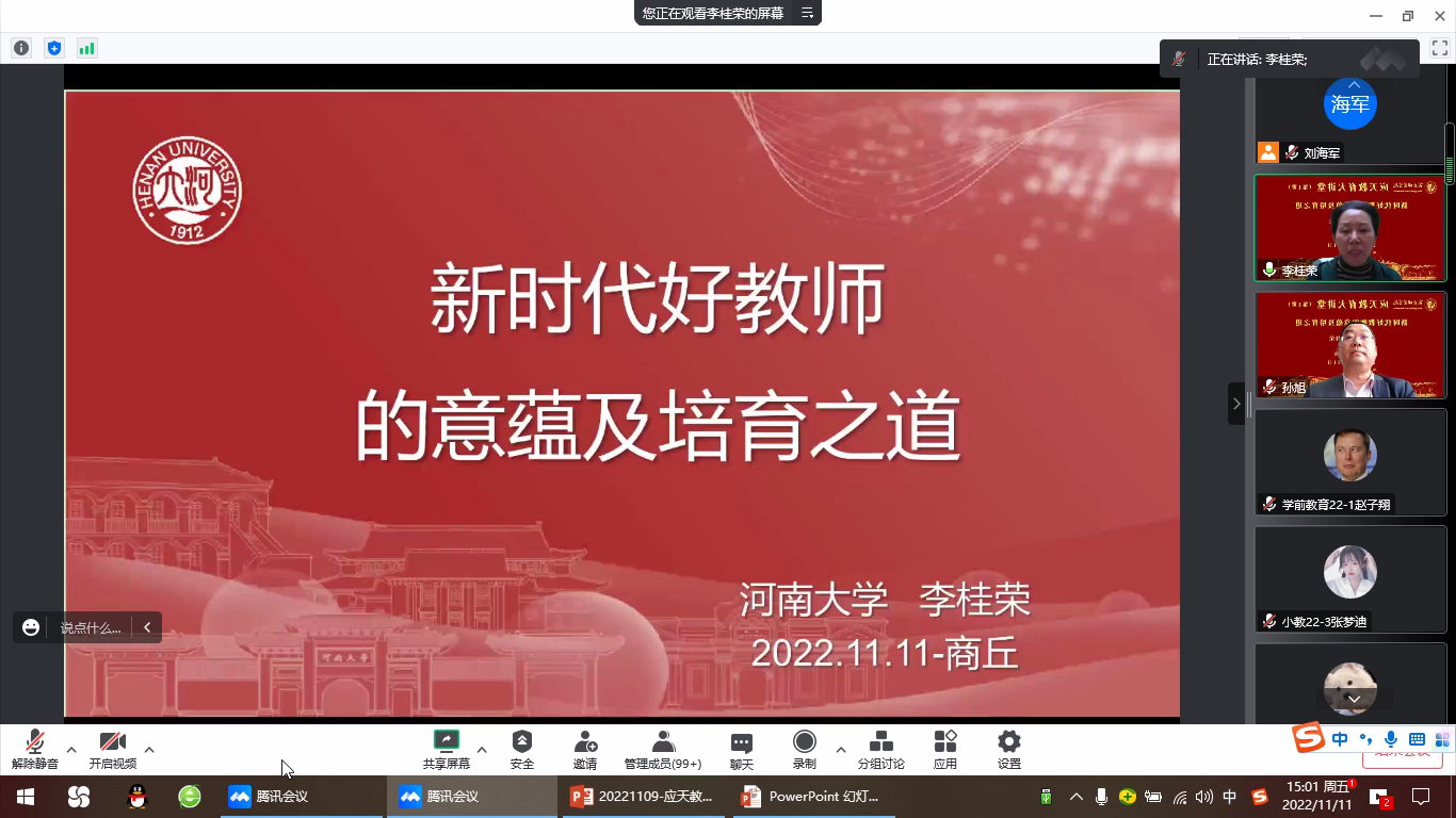 讲座过程中,李桂荣教授从加强师德师风建设的重要性入手,对教师师德失范、职业倦怠的具体表现进行了梳理,对师德师风建设的具体要求进行了明确,并从“有理想信念、有道德情操、有扎实学识、有仁爱之心”四个方面,对新时代好教师的意蕴及培育之道进行了详细阐释。李教授的报告立意高远,内容深刻,案例丰富,讲述生动,既有高度,又有温度,还接地气,让听课师生对新时代好教师的内涵有了更加深刻的理解和认识。