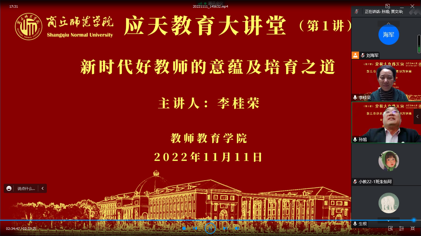 孙旭对“应天教育大讲堂”进行了简单介绍:应天教育大讲堂是学校为传承应天书院办学精神,凝练教师教育特色,打造教师教育品牌,以教师教育和基础教育发展为中心搭建的学术交流平台,目的是加强与兄弟院校、科研机构和地方教育行政部门及中小学一线名师的沟通交流,活跃学术交流氛围,开阔师生学术视野。