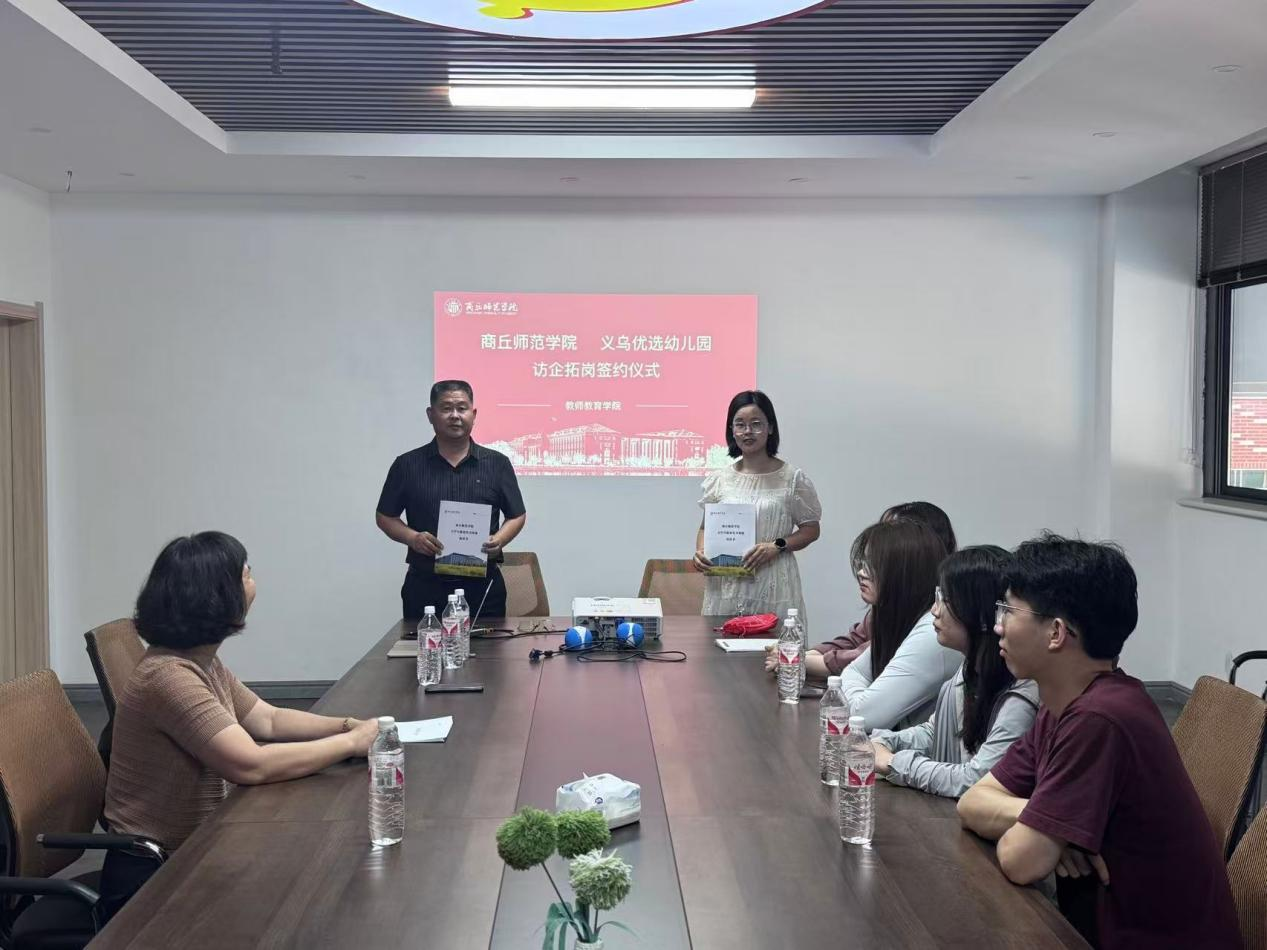 学院一行来到浙江省义乌市优选幼儿园开展实践调研,走进课堂观摩教学实践,与学校校长、骨干教师进行面对面交流。在座谈中,邱友谊介绍了我院基本情况,着重强调我院坚持把培养学生思想品德和教学能力放在工作第一位,双方围绕“新时代教师核心素养”“师范生实践能力培养”“校地协同育人机制” 等核心议题展开深入探讨,并签订就业实习基地协议书。