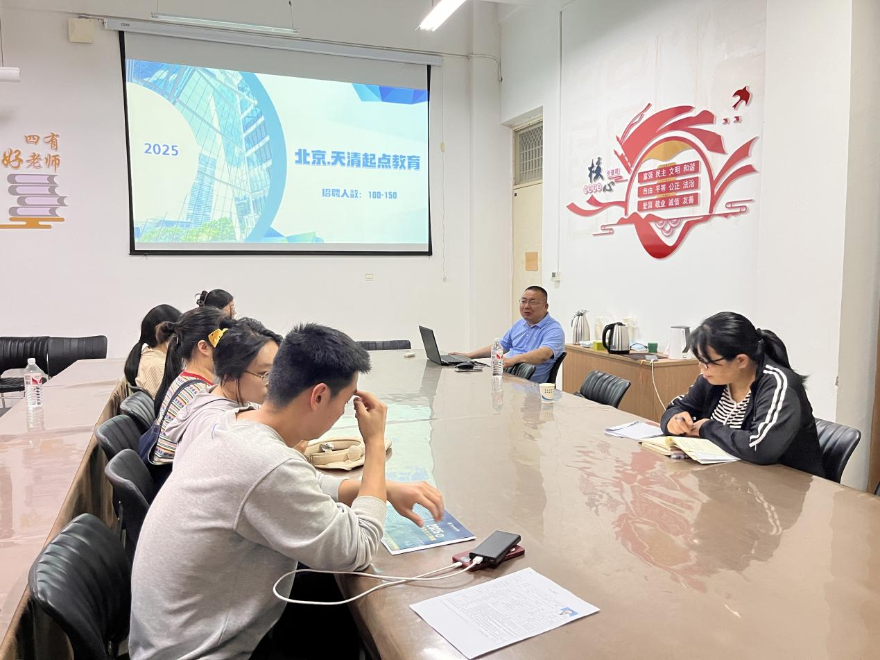 招聘会现场,北京天清起点教育胡老师就教育集团基本情况、岗位需求、工作薪资等方面进行了详细介绍。在场的毕业生积极了解心仪的岗位,与宣讲人员互动交流。