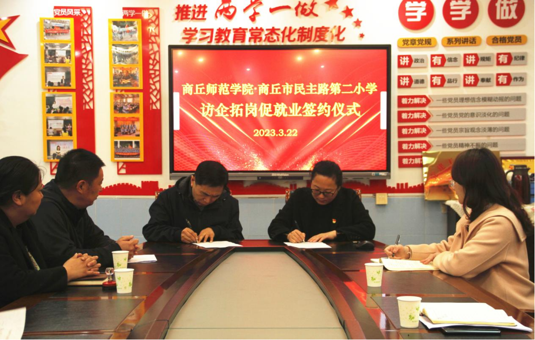 座谈会上,陈瑞红副校长介绍了商丘市民主路第二小学的发展历程、办学理念,蒯秀丽表示,WilliamHill威廉希尔始终以就业育人为目标,将毕业生就业工作摆在突出位置,以用人单位需求为导向,不断培养更多优秀的教育专业应用型人才。随后,蒯秀丽与张国栋校长共同签署“签订了就业实习基地协议”。