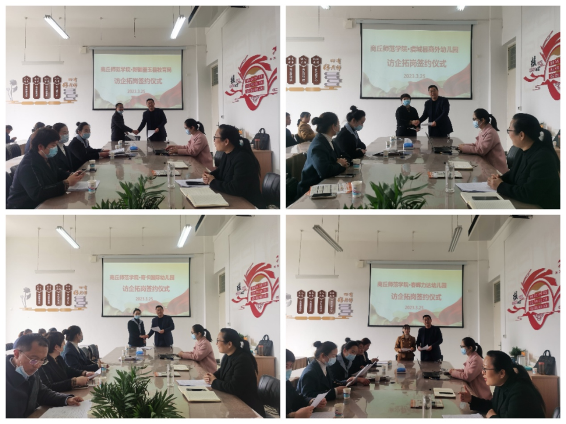 3月25日,以威廉希尔中国2023年毕业生春季双向选择洽谈会为契机,WilliamHill威廉希尔于汉梁楼203会议室开展访企拓岗专项行动。学院邀请春晖力达幼儿园、奇卡国际幼儿园、虞城县商外幼儿园、新疆墨玉县教育局等四家单位来我院商谈毕业生实习就业校企合作项目,学院党委书记蒯秀丽、院长孙旭、学工办主任李秀勤、毕业班辅导员赵鋆超以及四家单位相关负责人参加签约仪式。