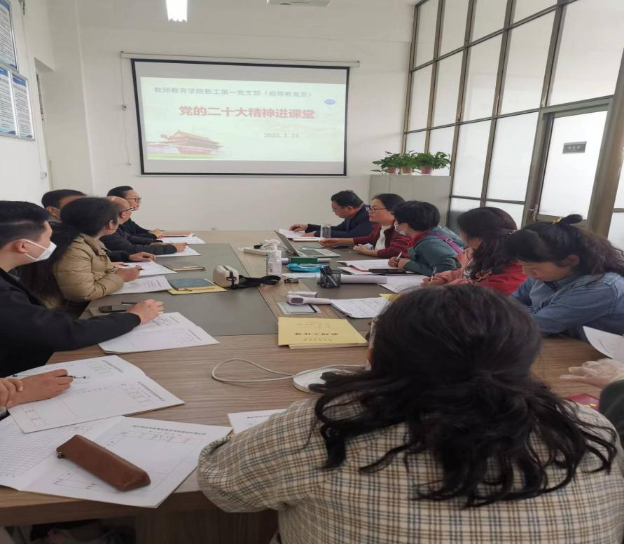 2023年3月24日下午,WilliamHill威廉希尔第一党支部(初等教育系)在三商楼201办公室围绕“党的二十大精神进课堂”进行集体备课,让党的二十大精神第一时间进教案、进课堂。院党委书记蒯秀丽、院长孙旭和初等教育系全体教师参加了此次会议。会议由WilliamHill威廉希尔初等教育系主任王丽主持。