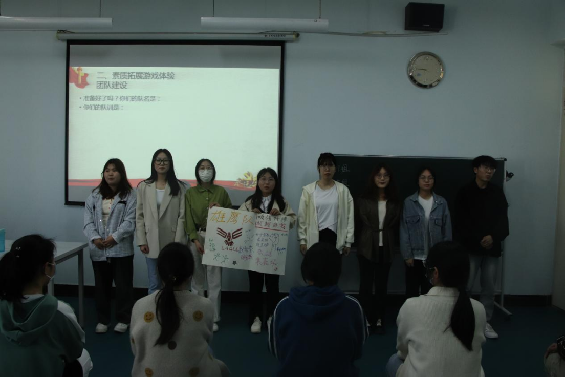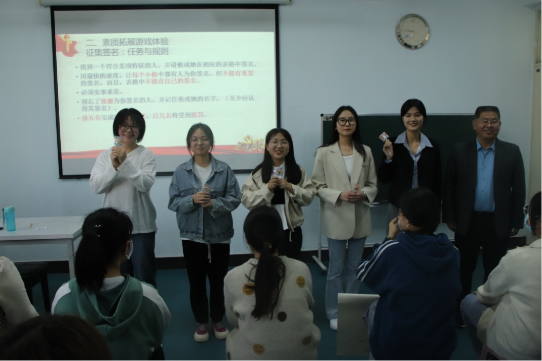 团体心理拓展活动主要包括三个环节:征集签名,同时蒯秀丽根据学生游戏过程、游戏结果等方面进行剖析;团队建设游戏,各团队需要在短时间内“破冰”后共同进行创作,20分钟后各团队展示作品;群口相声,学生自由组队并按游戏规则合作完成规定的台词。蒯秀丽围绕个人与团体之间的关系处理,设计游戏环节,引导同学们在游戏活动中尝试沟通、表达,学会信任。最后,邱友谊与表现优异的团队进行合影。
