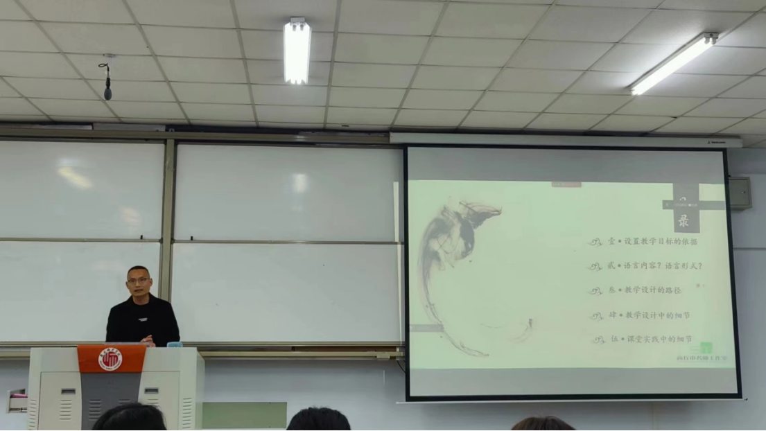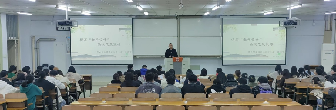 首先,侯德重老师以苏联作家苏霍姆林斯基《给教师的建议》引出本次讲座,教导学生要经常阅读并寄语“读书不是为了应付明天的课堂,而是出自内心的喜欢和对知识的渴望。”紧接着侯老师结合具体课堂课例和教学经验,从“教学目标的依据”“语言内容和语言形式”“教学设计的路径”“教学设计的细节”“课堂实践的细节”这五个方面详细讲述了如何完成一篇优秀的小学语文教学设计。侯老师重点讲述了教学目标如何撰写以及教学过程的撰写思路,提供了逆向设计这一教学设计方法,同时鼓励同学们在教学中要不断阅读,感悟和理解,积极将所学知识运用到具体教学活动中。