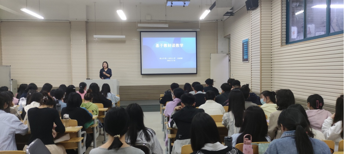 孙媛媛老师结合自身教学经验结合课例分析,向同学们清晰阐述了如何从吃透教材到吃透学生再到最后以学定教。孙老师从“怎么样读准教材”、“怎么样读懂学生”、“怎么样实施教学”这三个方面讲述了如何基于教材谈教学。孙老师指出:读准教材,要读通课标、读懂教材;读懂学生,读懂数学,让学生喜欢数学;课堂教学,要做好读课标、看教参、挖教材、后反思的上课四步曲,用好教材上好课。