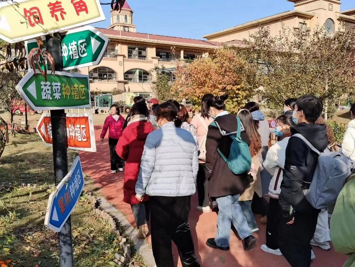 首先,徐艳老师带领全体学生进行户外环境创设的参观学习。园内精致的仿生自然景观、童趣的游乐设施、大片的橡胶场地、蔬菜种植园、中草药种植园、粮食作物种植园、果树种植园和饲养区等为幼儿的自然游戏提供了充分的探索空间。这些区域实施分班种植和管理,为幼儿提供了自我服务与自我管理的机会。