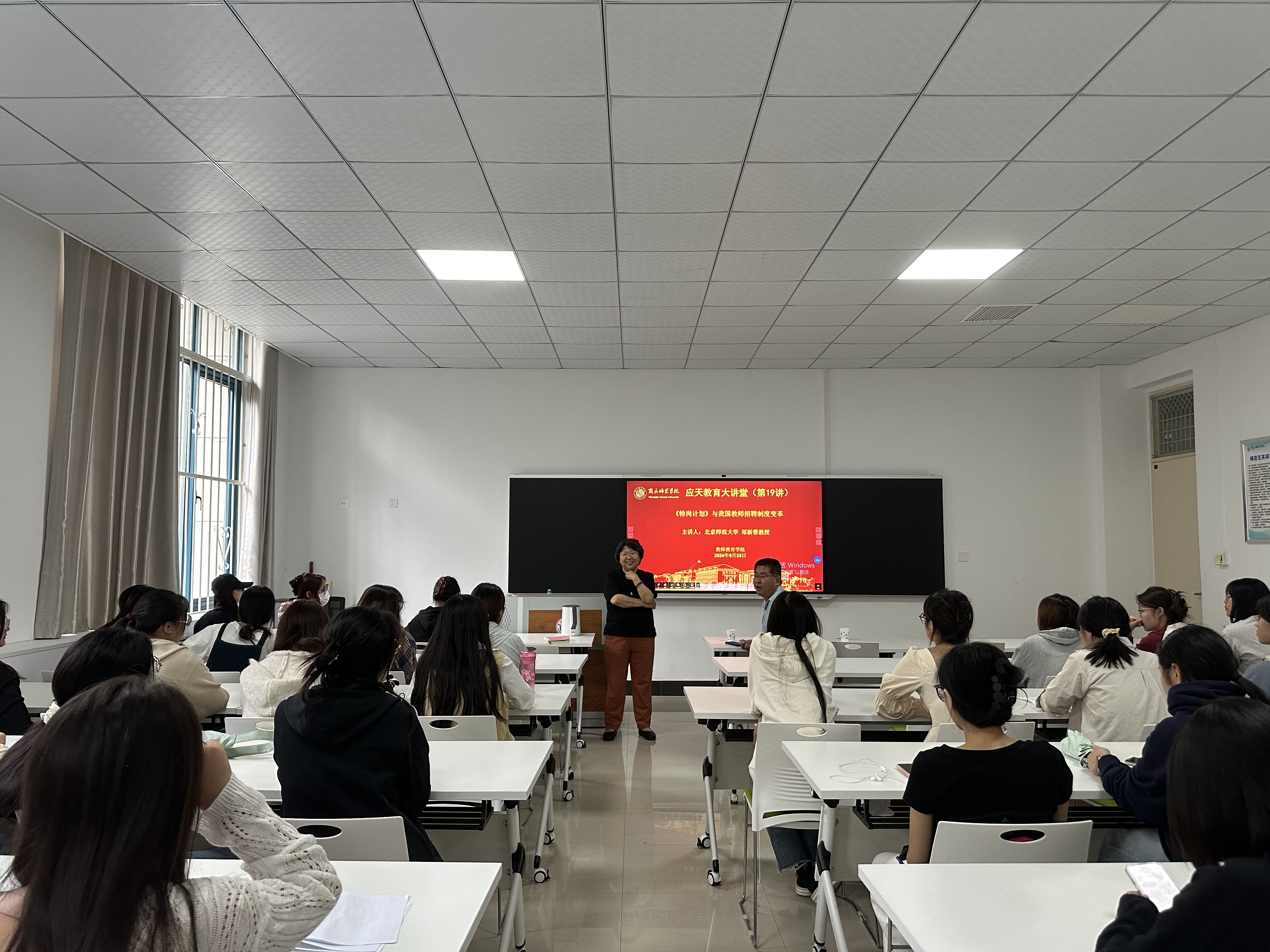 郑新蓉教授从我国县域农村教师招聘的困境、《特岗计划》的实施及成效、制度创新与教师招聘的变革四个方面,对《特岗计划》的出台背景、实施目的、发展成果、重要意义和历史影响进行了细致分析。郑教授强调,该计划通过创新招聘方式、提高招聘标准,有效提升了教师队伍的整体素质,为我国教育事业的持续发展注入了新的活力讲座过程中,郑教授还与师生们进行了互动交流,就大家关心的问题进行了解答,鼓励师生们要密切关注教育政策动态,积极参与教育改革实践,为推动我国教育事业的繁荣发展贡献自己的力量。